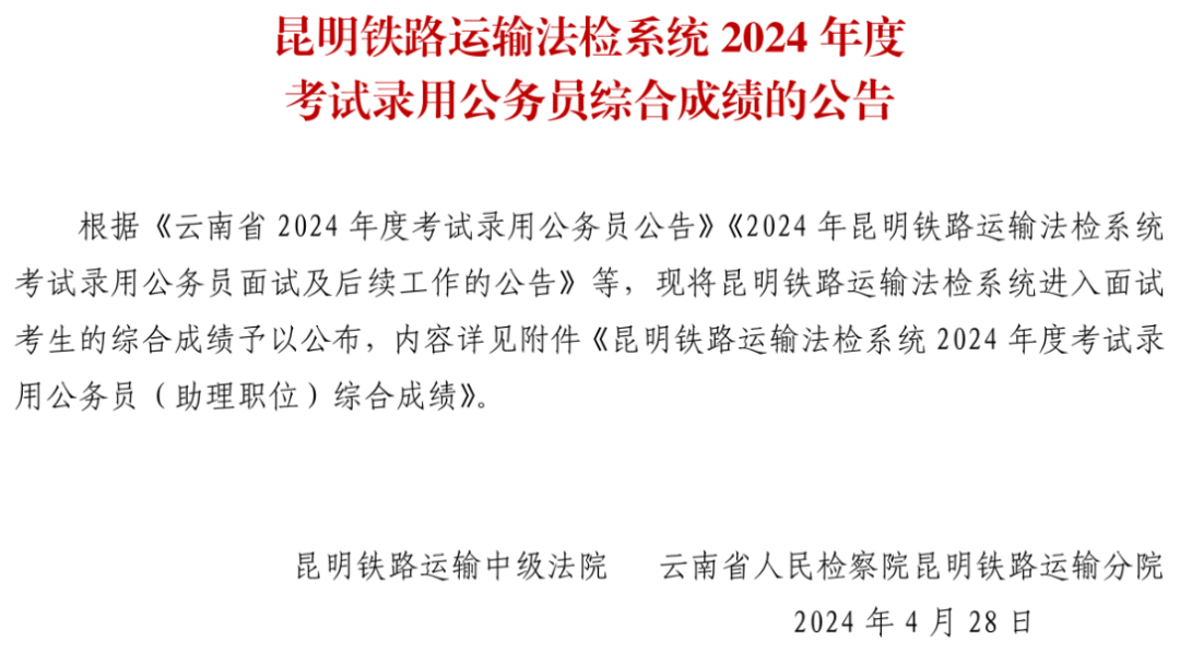 昆明铁路运输法检系统2024年度考试录用公务员综合成绩的公告